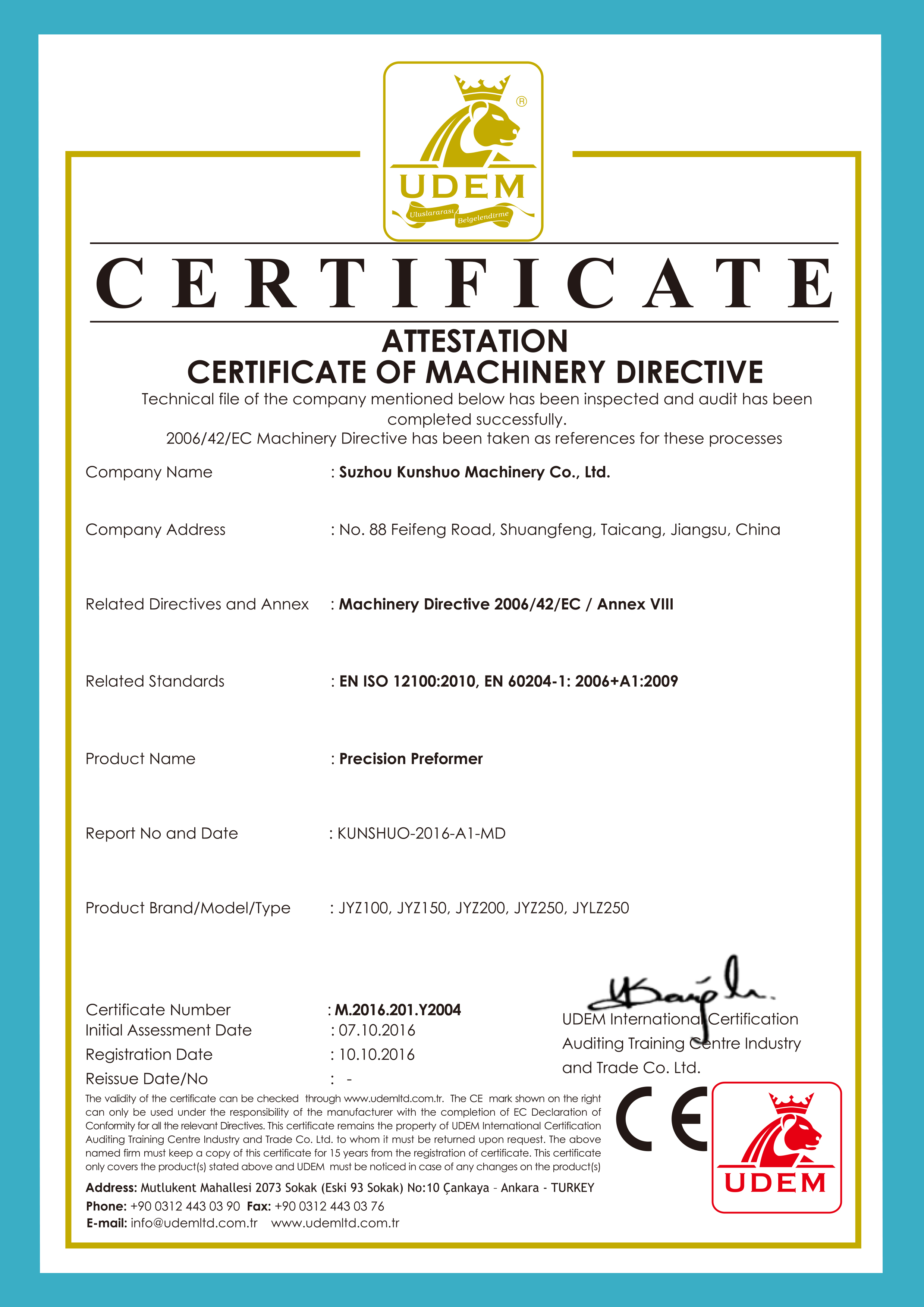 精密預(yù)成型機(jī)CE證書(shū)