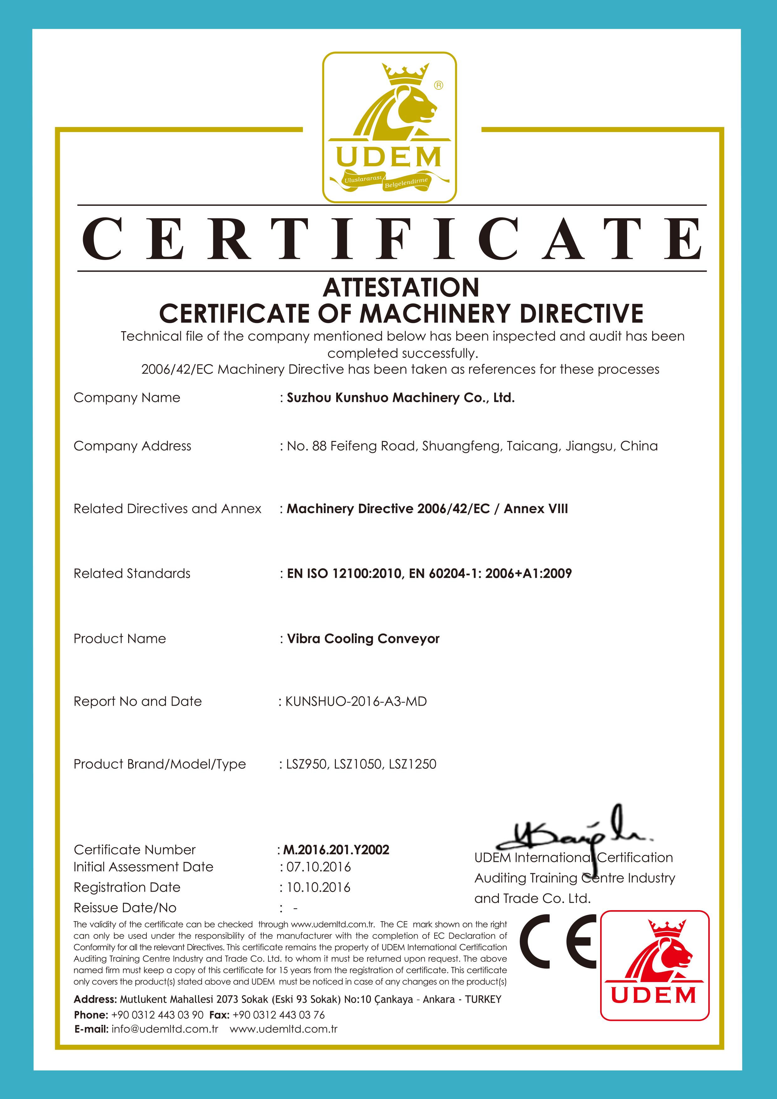 振動(dòng)式冷卻輸送機(jī)CE證書(shū)