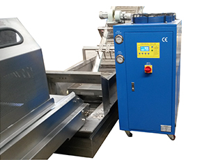 通過冷卻水或冷卻溶液使膠坯降溫,再經(jīng)過強制風冷,使膠坯不變形、更加穩(wěn)定。該機特點是全程調(diào)節(jié)水平不銹鋼網(wǎng)帶調(diào)控運行速度,配合預成型機的所有切割速度。